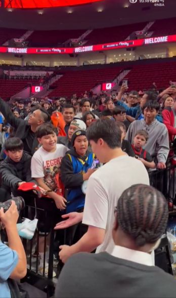 雷速体育10月25日讯 NBA常规赛继续进行,开拓者今天在主场迎战勇士。NBA官方社交媒体晒视频,赛前不少球迷在通道等待杨瀚森。 小球迷见到杨瀚森难掩激动,他将球鞋送给了小球迷
